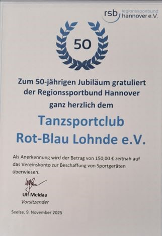 Der Tanzsportclub Rot-Blau Lohnde hatte für den 9. November zu seinem 50-jährigem Vereinsjubiläum in das Bürgerhaus eingeladen und konnte neben zahlreichen Gästen aus Politik und den Verbänden auch einige Gründungsmitglieder sowie die Tanzlehrer und Vereinsförderer begrüßen.